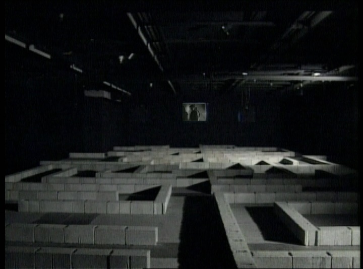 The video film replicates the labyrinth presented in the installation of the same title. Bricks are placed on the floor, and they pass into the labyrinth on the screen. The figures never come from behind the walls of the labyrinth, we can only hear the sound of their fleeting steps.